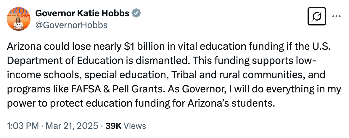 When it comes to education, there is room for a variety of POV‘s- but have concluded you guys are not really interested in providing the information necessary to have a meaningful discussion . For example, don’t you think it would be helpful for your readers to know how diverse the ESA user population is? https://x.com/katieratliefaz/status/1904685834416382330?s=46. Or why, given a choice, parents are increasingly removing their children from government run public schools? https://open.substack.com/pub/educatedandfree/p/your-kids-arent-learning-at-all?r=1pv2jp&utm_campaign=post&utm_medium=web&showWelcomeOnShare=false Or how the DOE has done absolutely nothing, during its existence, to elevate the educational performance of American kids? (you know, at some point, raising the whole “definition of insanity” thing?) https://open.substack.com/pub/bariweiss/p/betsy-devos-shut-down-the-department-of-education-trump-elon?r=1pv2jp&utm_campaign=post&utm_medium=email. ) https://www.city-journal.org/article/dismantle-department-of-education-trump-elon-musk.